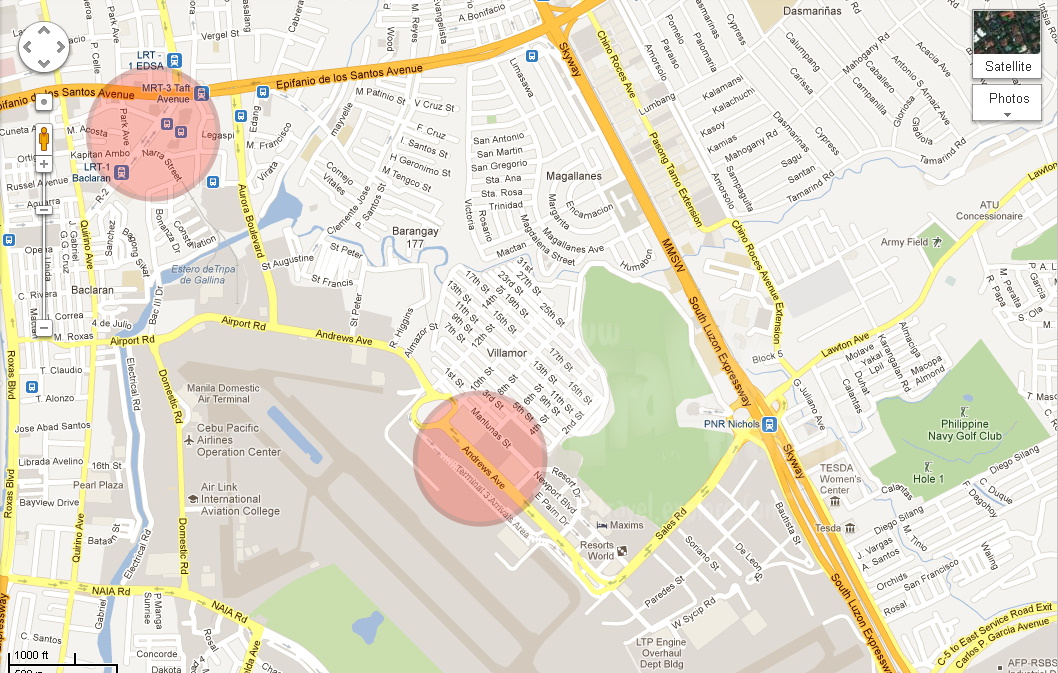 | The upper circle is where Pasay Rotunda located. The other one is the NAIA Terminal 3 area. |