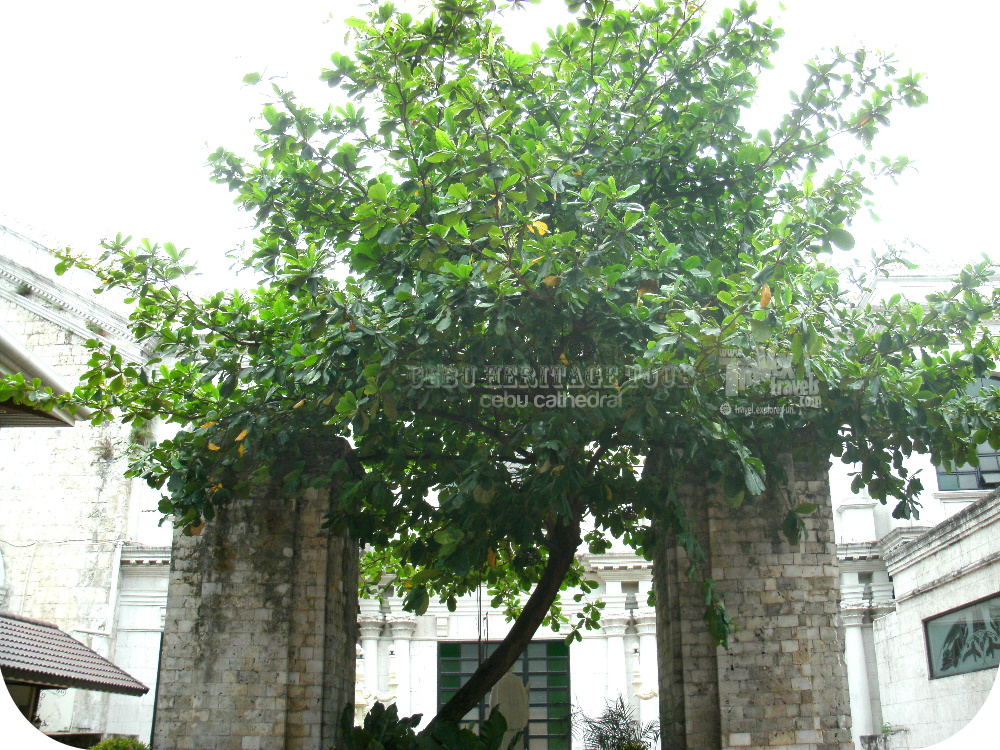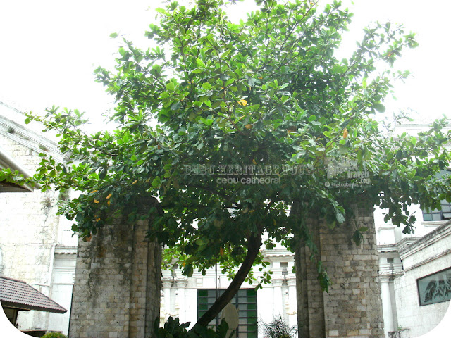 | An umbrella tree beside two column ruins of Cebu Cathedral |