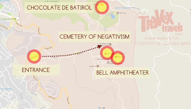 From the entrance of Camp John Hay, just walk straight, until you see signage going to Treetop Adventure. When you reach Treetop Adventure, Cemetery of Negativism is just nearby, and the Bell Amphitheater is beside it.