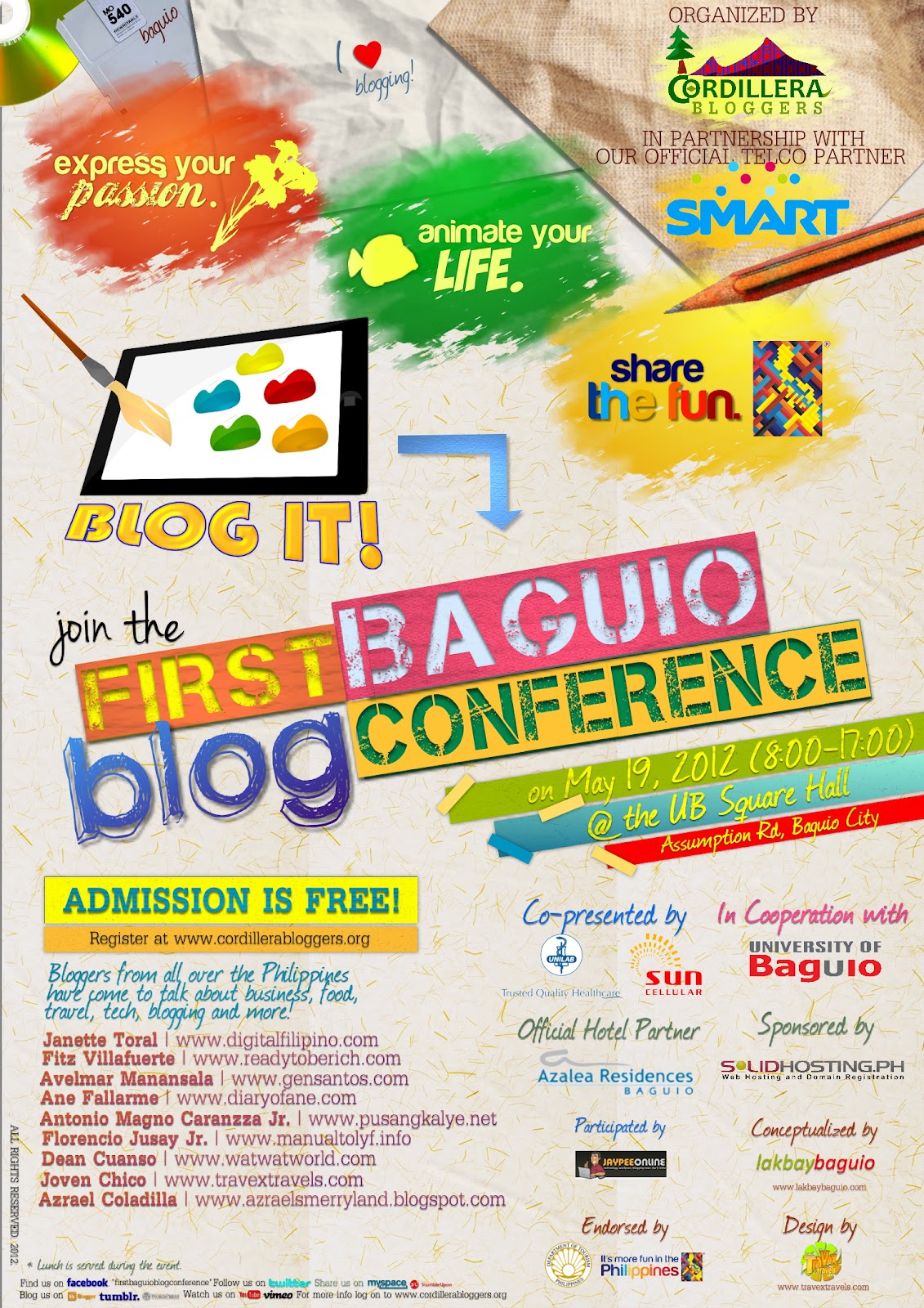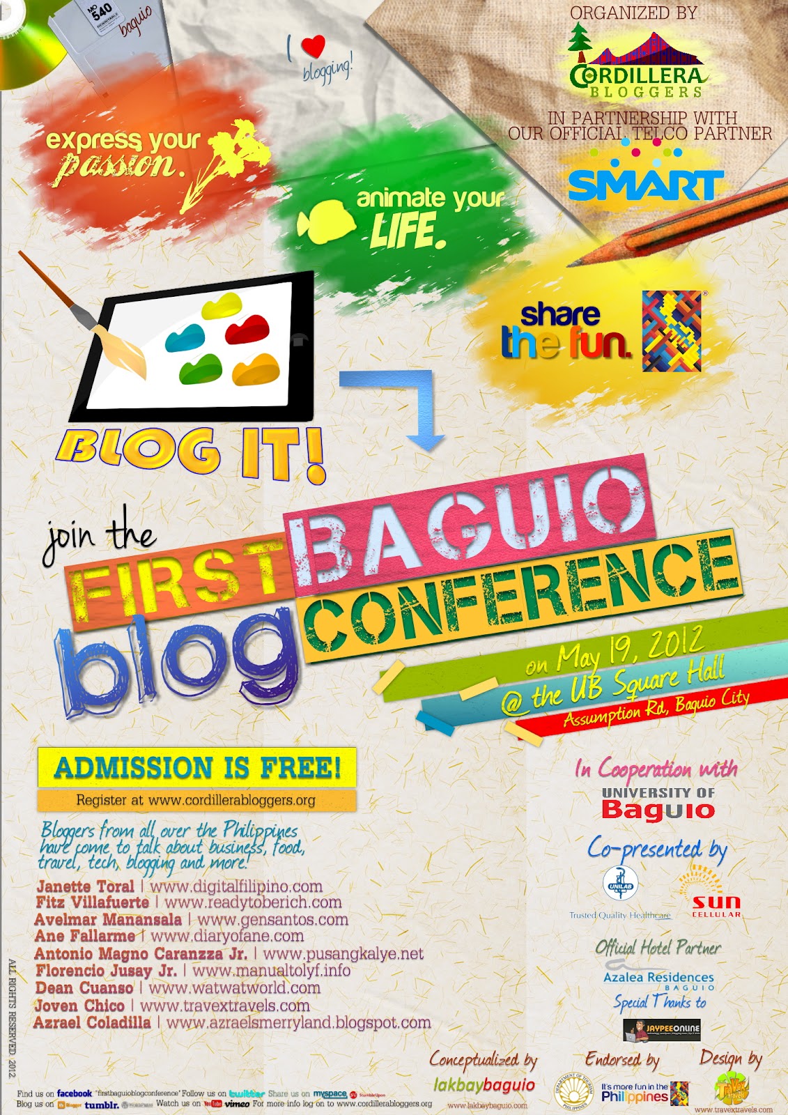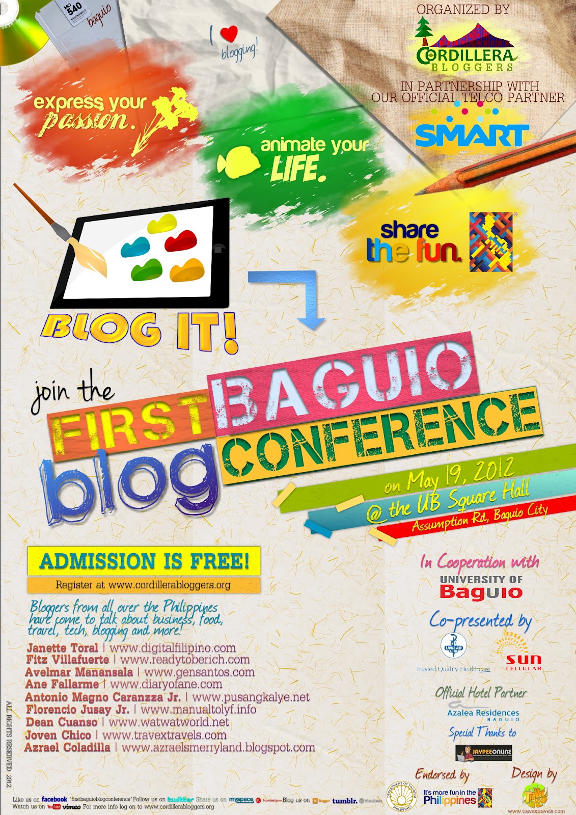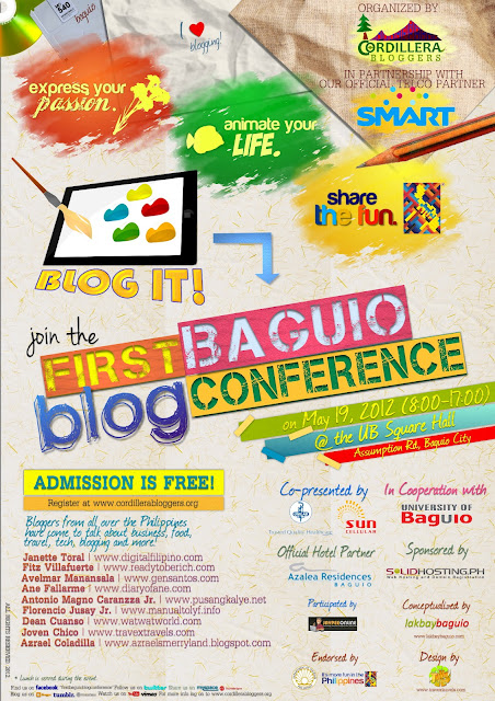 Bloggers out there and blog readers, this is for you. Blog fests had been done already in other parts of the country, but this time it's the Northern Luzon's moment to stand out its own blogging community. Spearheaded by the ideas of Vince of Lakbay Baguio, supported by Kat of Geek Camp Baguio and Dean of Wat Wat World, and finally put into designs by yours truly, Joven of Travex Travels, the Cordillera Bloggers, a newly formed blogging group, will be holding its first ever blog fest in the city of Baguio. The First Baguio Blog Conference to be held on May 19, 2012 (8 AM to 5 PM) at the UB Square Hall was in partnership with the leading telecommunication company in the country, SMART. Sun Cellular and Unilab co-presented this event and our official hotel partner's Azalea Residences Baguio. It is participated by Jaypee Online and endorsed by the Department of Tourism.